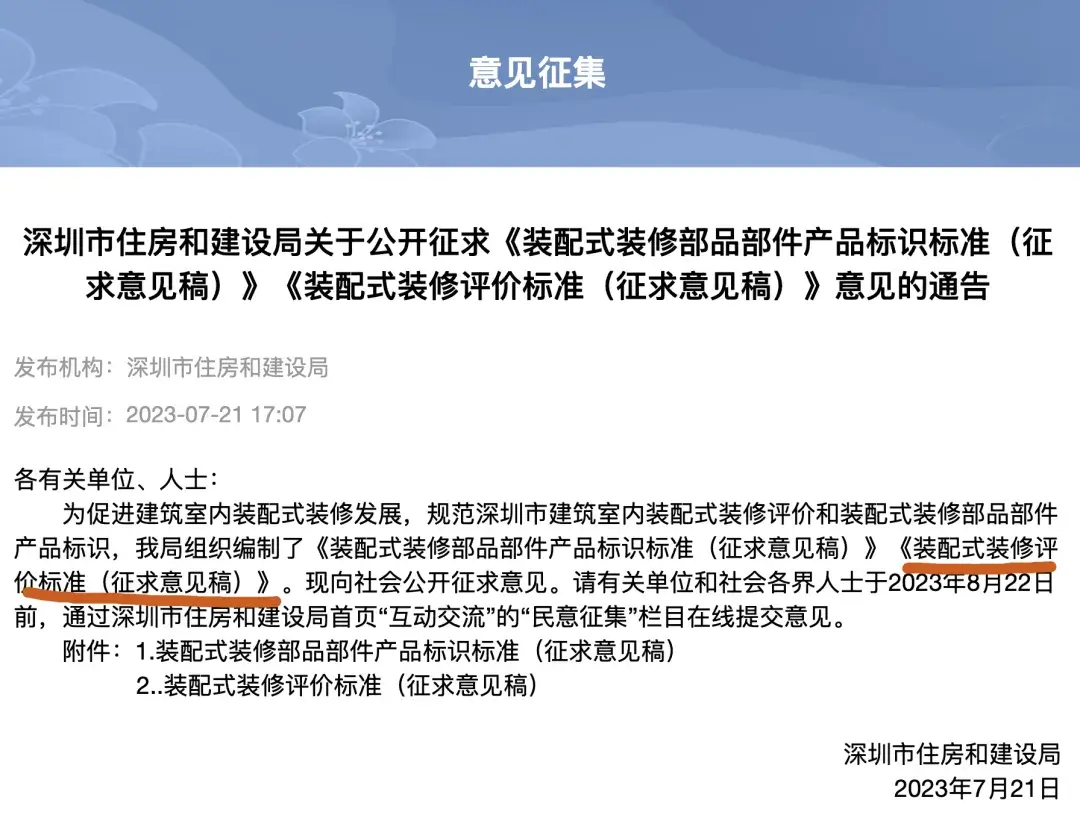 完成了《装配式装修评价标准》征求意见稿,并通过深圳市住房和建设局正式对外公开征求意见。